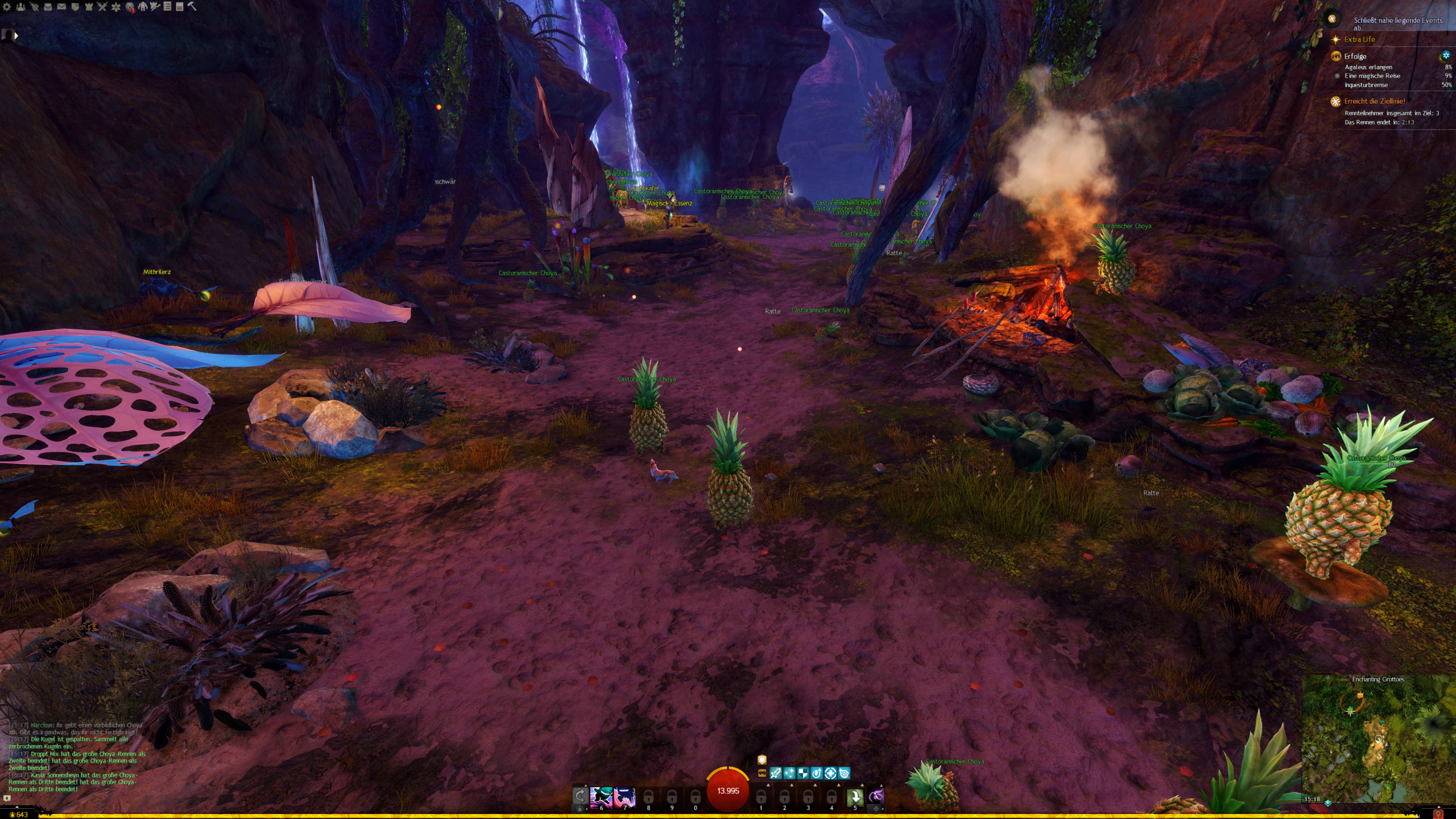 Bei den Zauberhaften Grotten im Osten der Karte findet ihr eine Siedlung von tropischen Choyas. Hier startet bei Narcisse das Abenteuer, bei dem ihr durch Kreise laufen müsst, verwandelt als Ananas-Choya. Mit dem 1er Skill könnt ihr dabei Vorwärts preschen, indem ihr rollt und mit dem 2er Skill springt ihr in die Höhe. Rollt ihr und setzt dann zum Sprung an, erhaltet ihr einen deutlichen Vorschub. Schaut euch die Strecke in Ruhe an und fangt die Skills an zu kombinieren, um schnell durch den Parcour zu kommen. Freude macht es in dieser putzigen Form alle Mal.