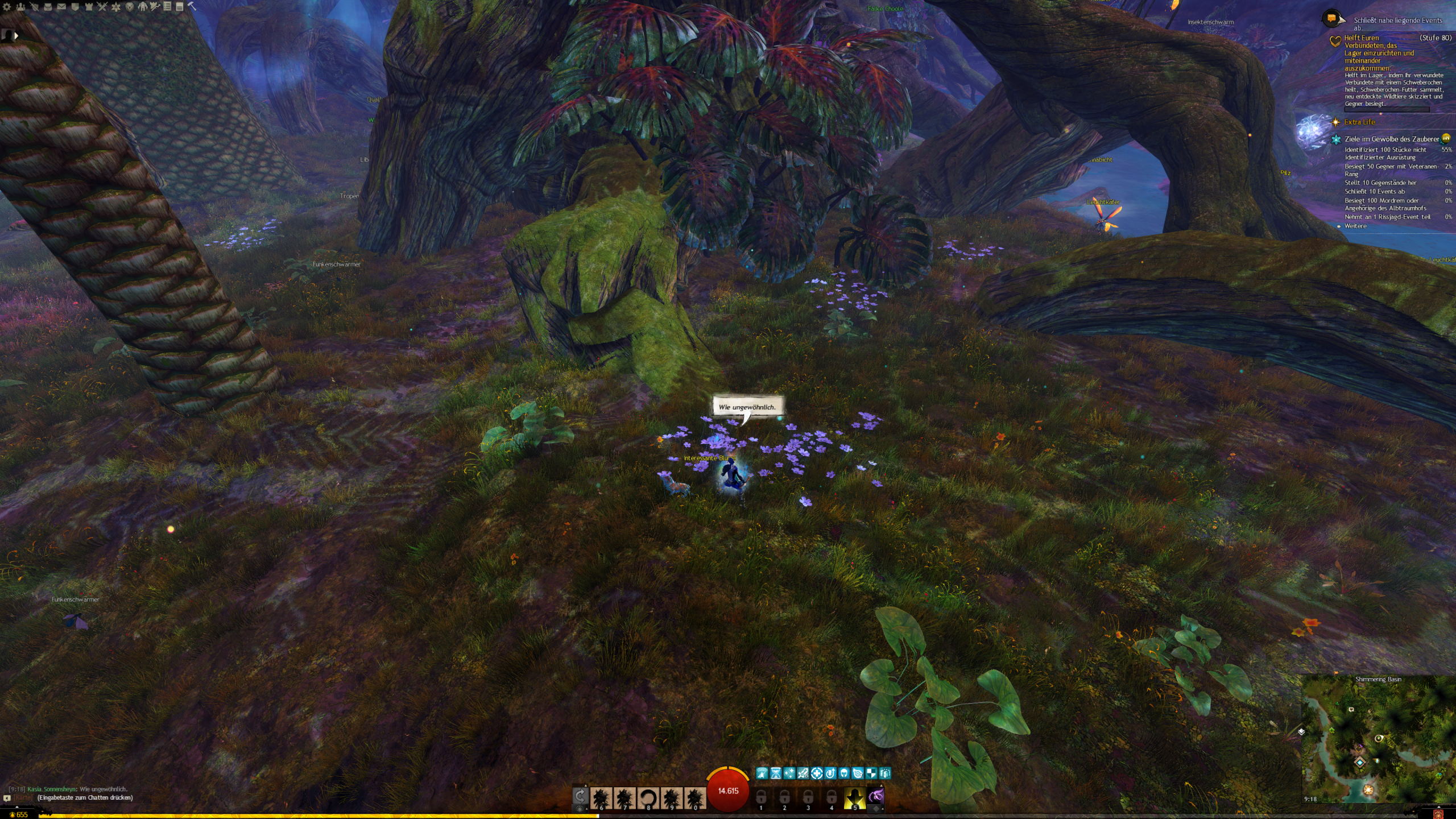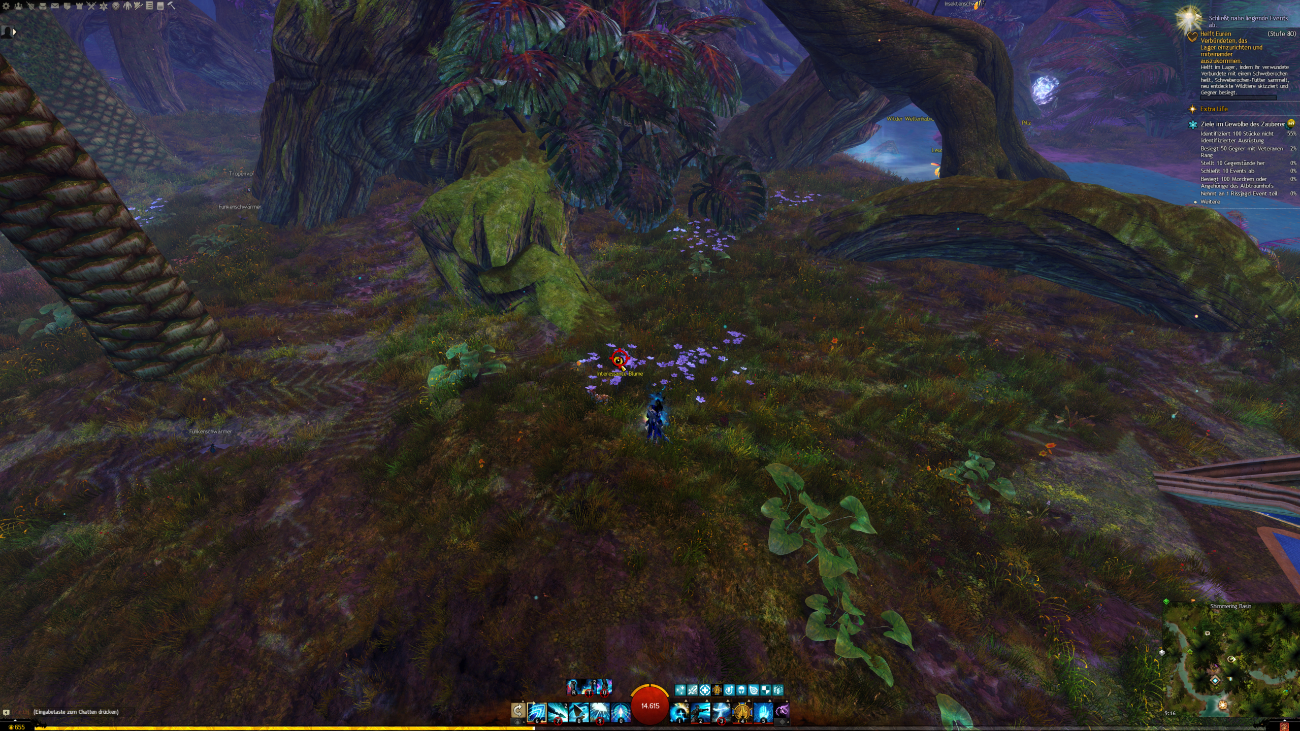 Dasn Ansehen-Herz befindet sich im südlichen Zentrum der Karte “Sternenlicht-Gehölz | Starlit Weald”. In diesem Gebiet, wo das Herzchen aktiv ist, findet ihr interessante Tiere und pflanzen. Interagiert mit ihnen, um den Zeichenmogus zu aktivieren. Dies ist ein Quicktime-Event, was wir noch aus dem Norden von Janthir Syntri kennen. Dabei springt der linke Teil der Skillbar um und es sind Farbklekse und ein Pinselstrich zu sehen. Wir müssen immer den Pinselstrich treffen, um eine korrekte Zeichnung zu erhalten.
