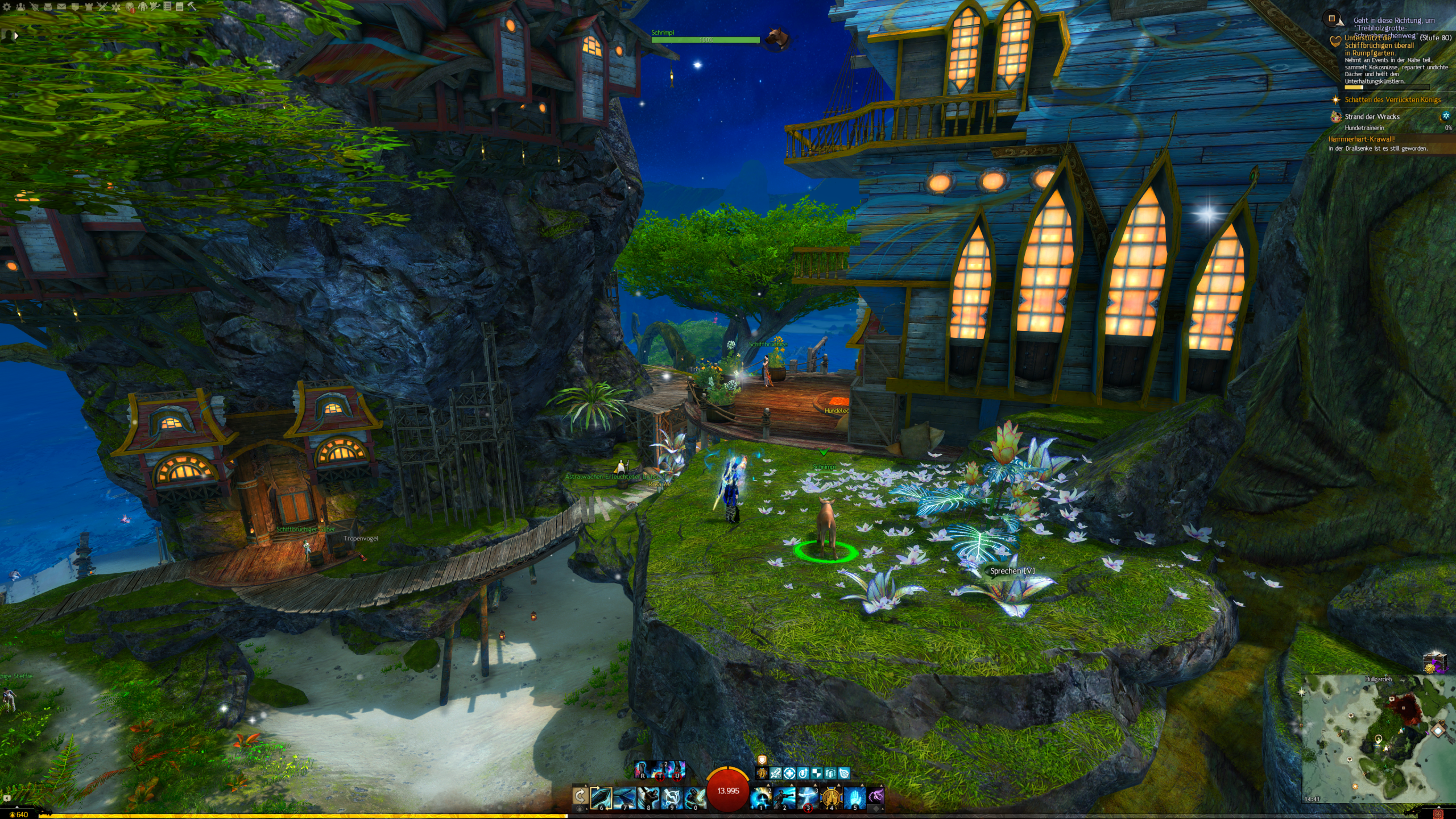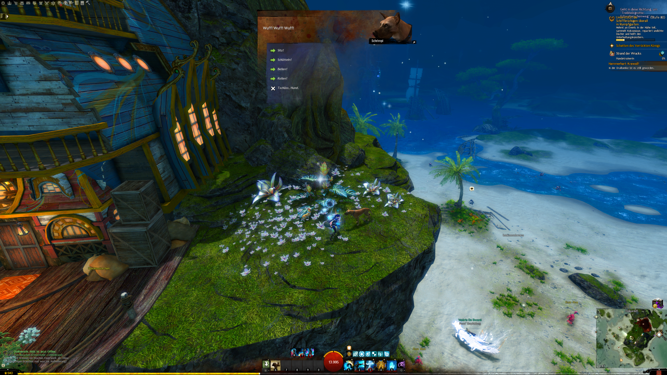 In Rumpfgarten | Hullgarden findet ihr auf einem Vorsprung den Hund Schrimpi | Shrimpy. Dieser steht vor einem Haus, ovr dme ein Sack mit Hundeleckerchen steht. Nehmt eines davon und bringt es ihm. Ein Dialogfenster erscheint. Nun macht ein Kunststück nach dem anderen mit ihm, aber vergesst nicht die extrinsische Motivaiotn. Er möchte jedes Mal ein Hundeleckerchen haben.