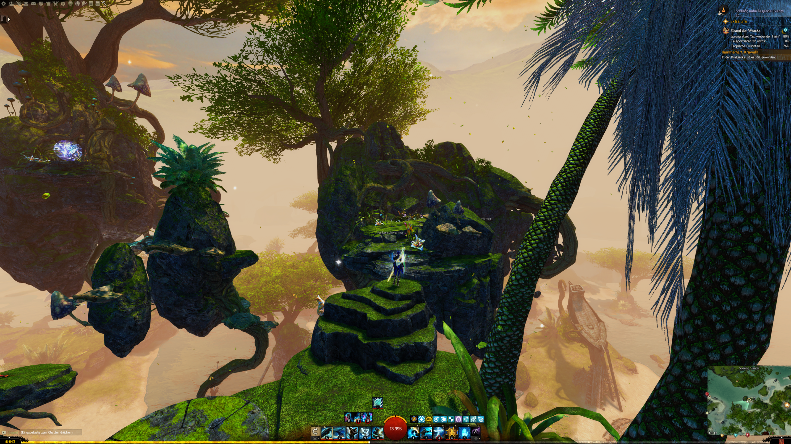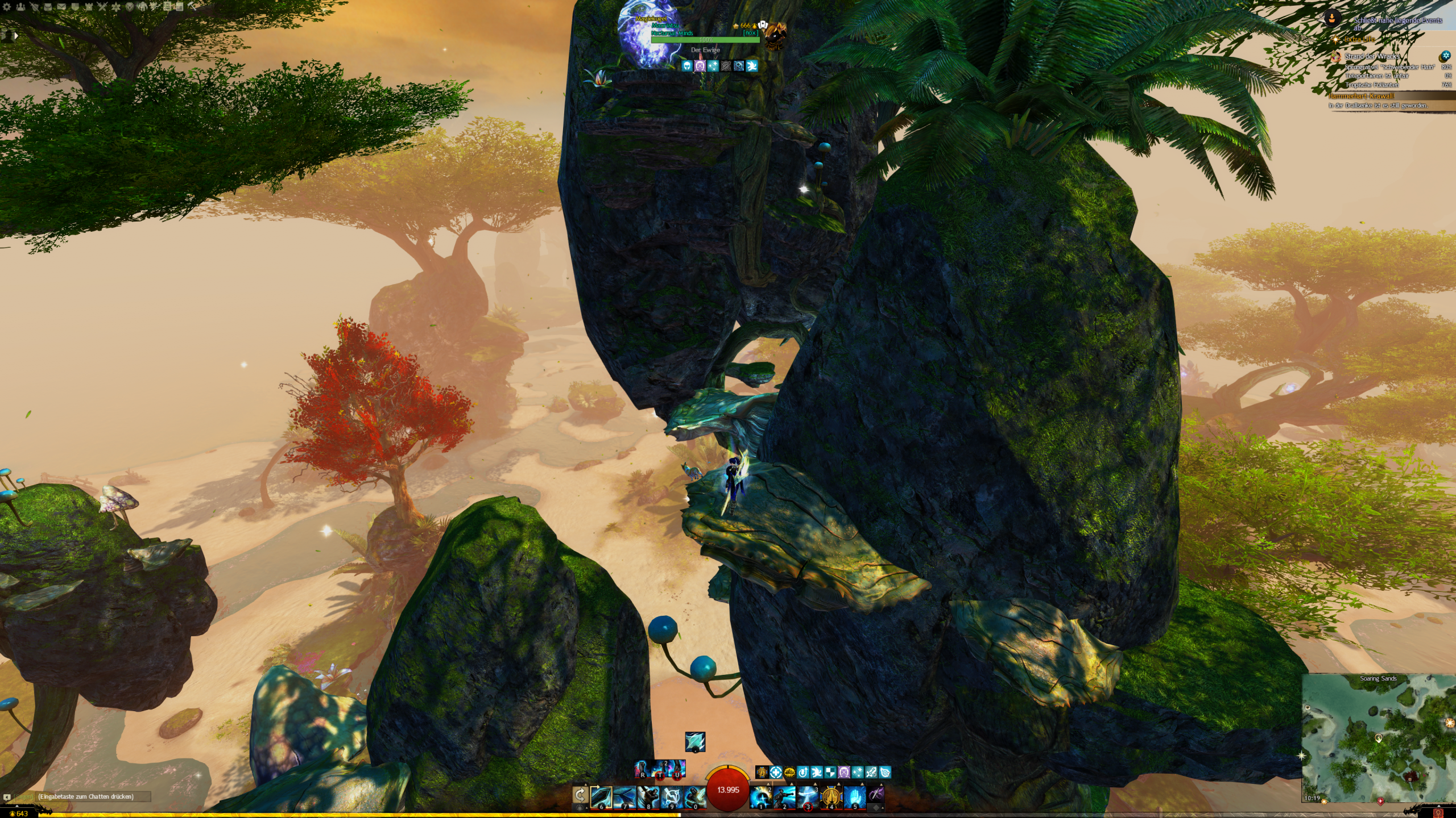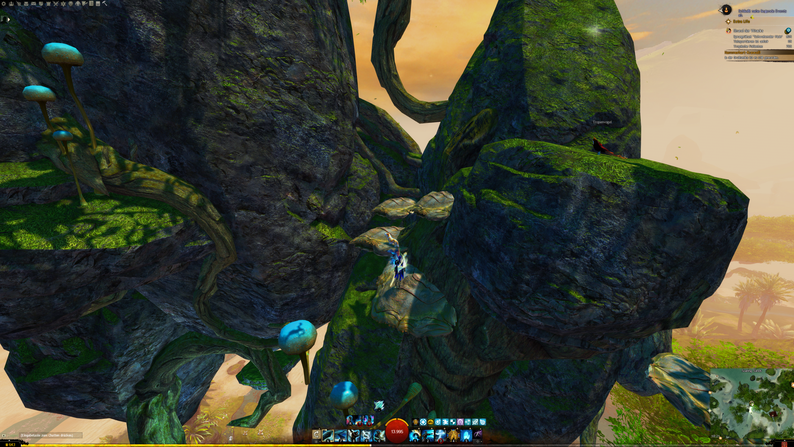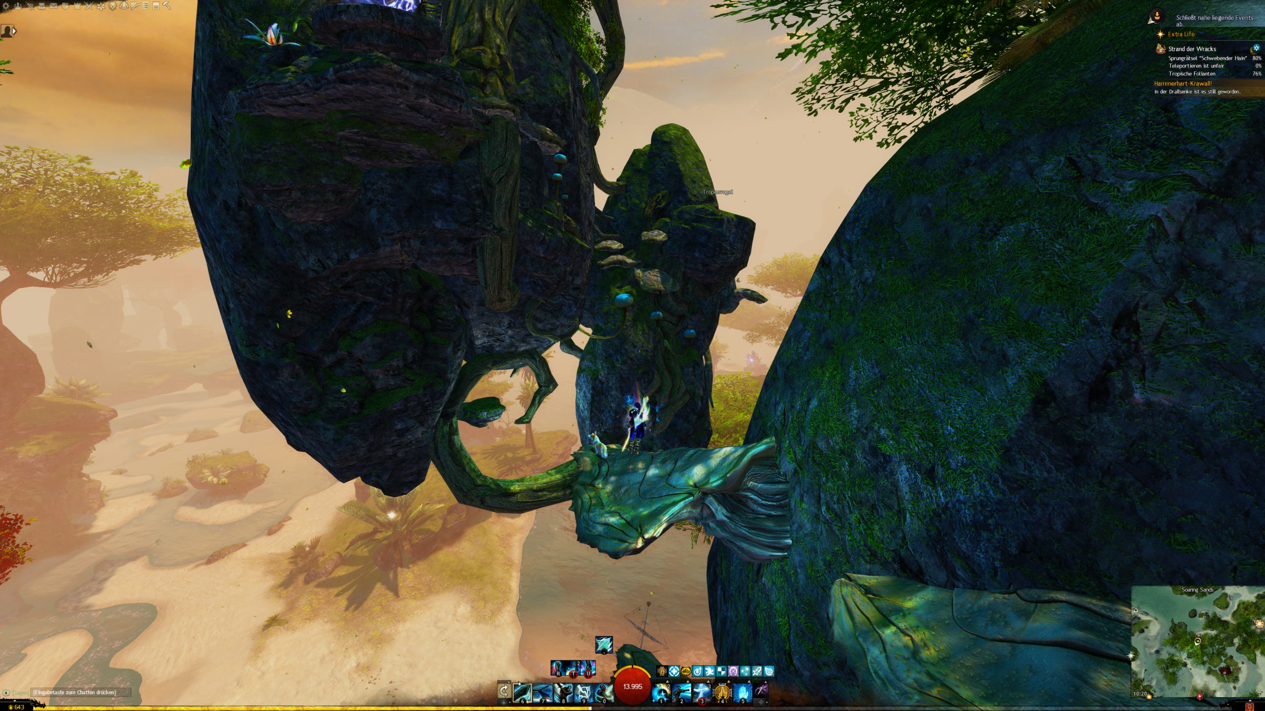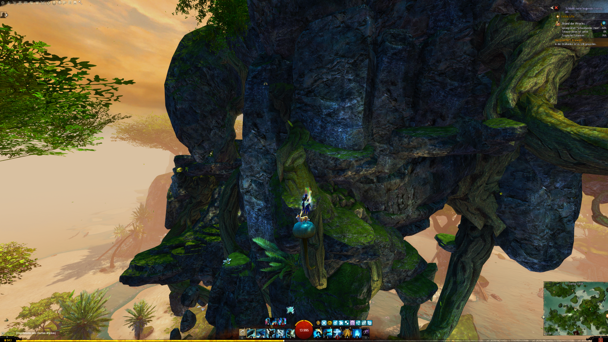 - die Jadebot-Wegmarke nutzen – Sie hat zwar einen hohen Cooldown, aber wenn ihr fallt öffnet ihr den Gleiter und portet euch hoch. OBACHT: Dabei verliert ihr jedoch den oben geannten zusätzlichen Erfolg!