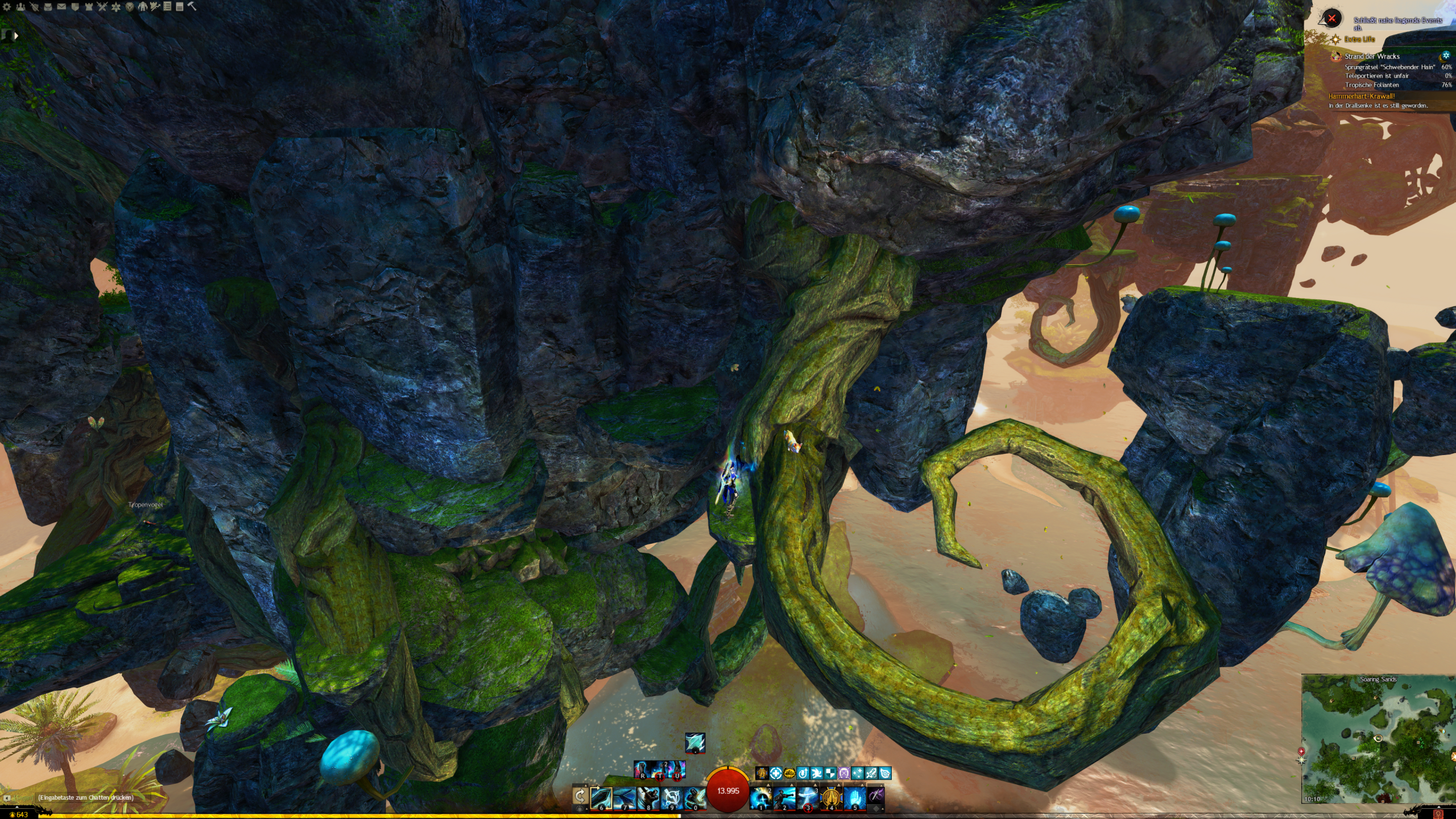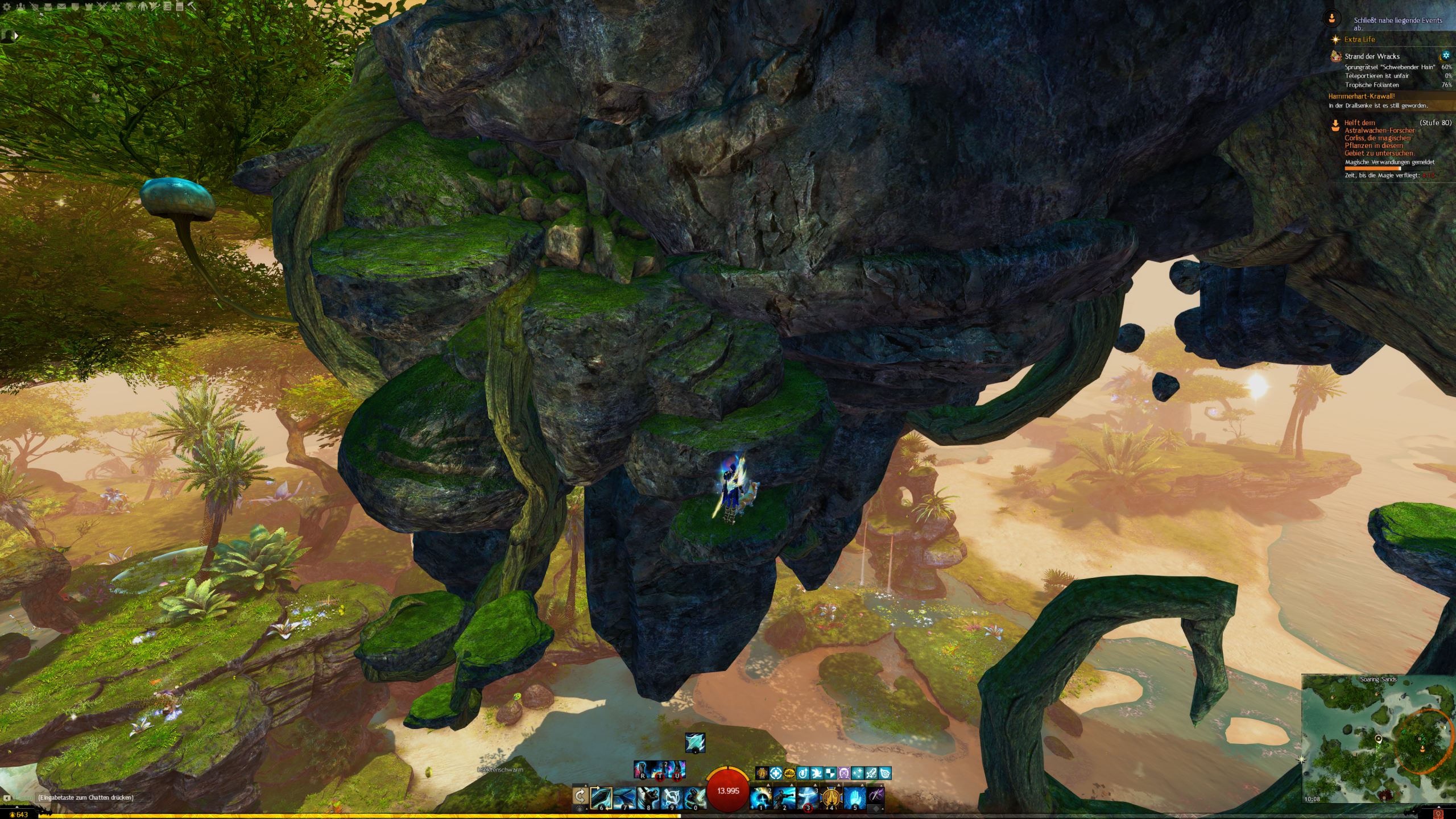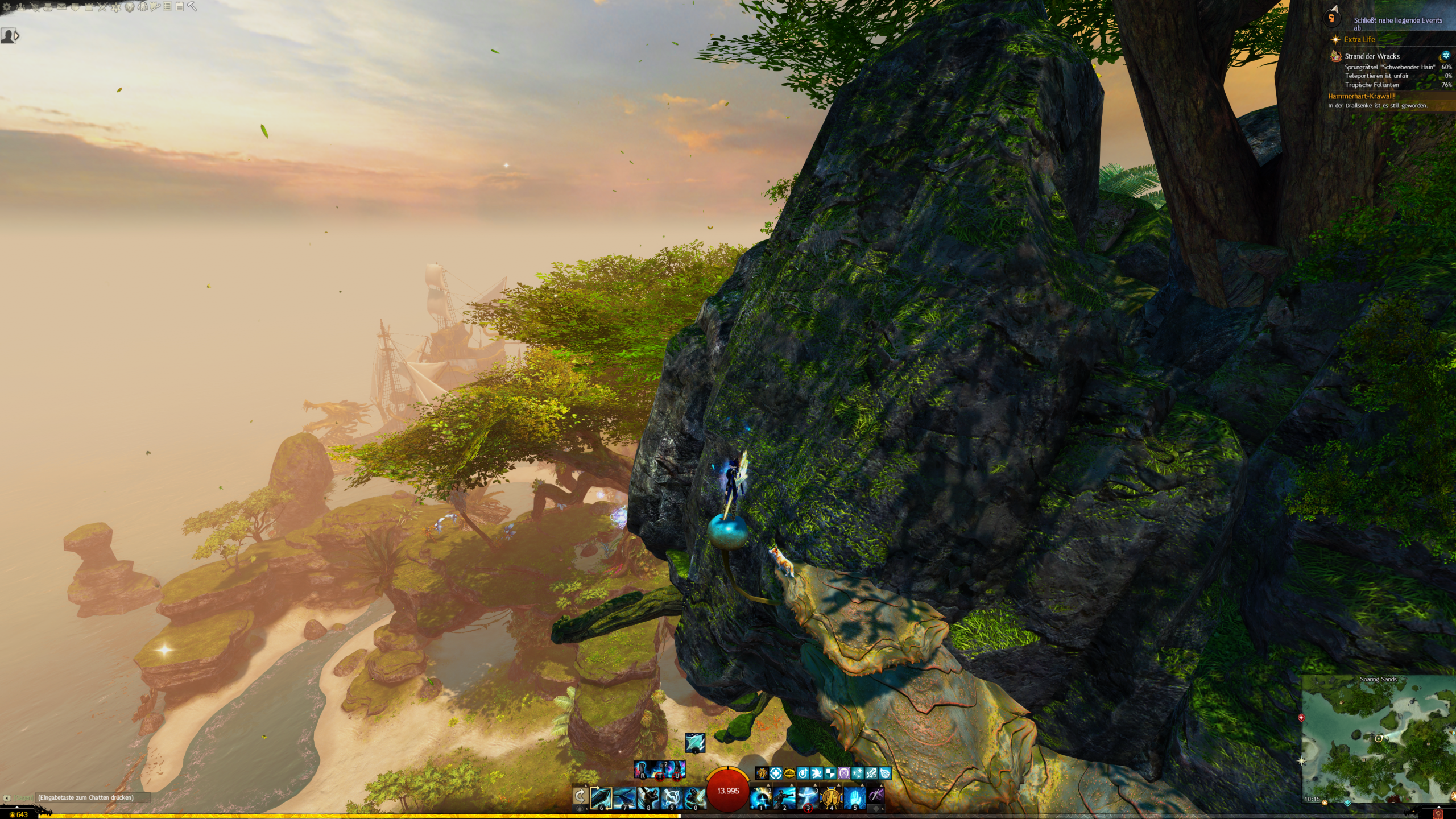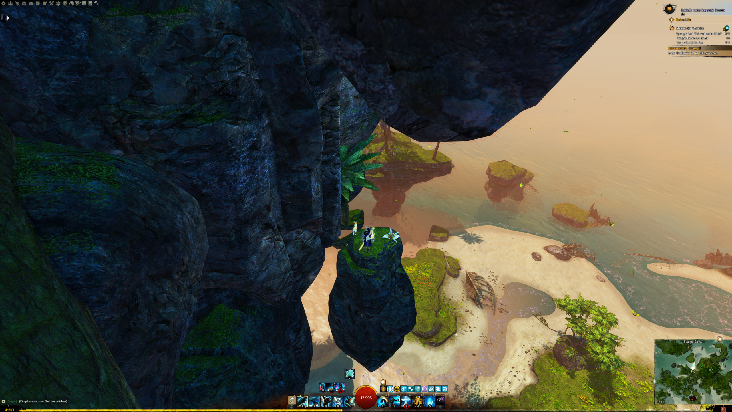 - die Jadebot-Wegmarke nutzen – Sie hat zwar einen hohen Cooldown, aber wenn ihr fallt öffnet ihr den Gleiter und portet euch hoch. OBACHT: Dabei verliert ihr jedoch den oben geannten zusätzlichen Erfolg!
