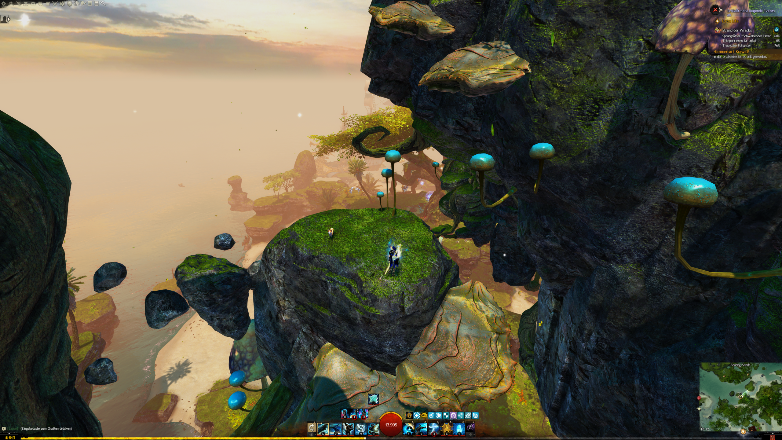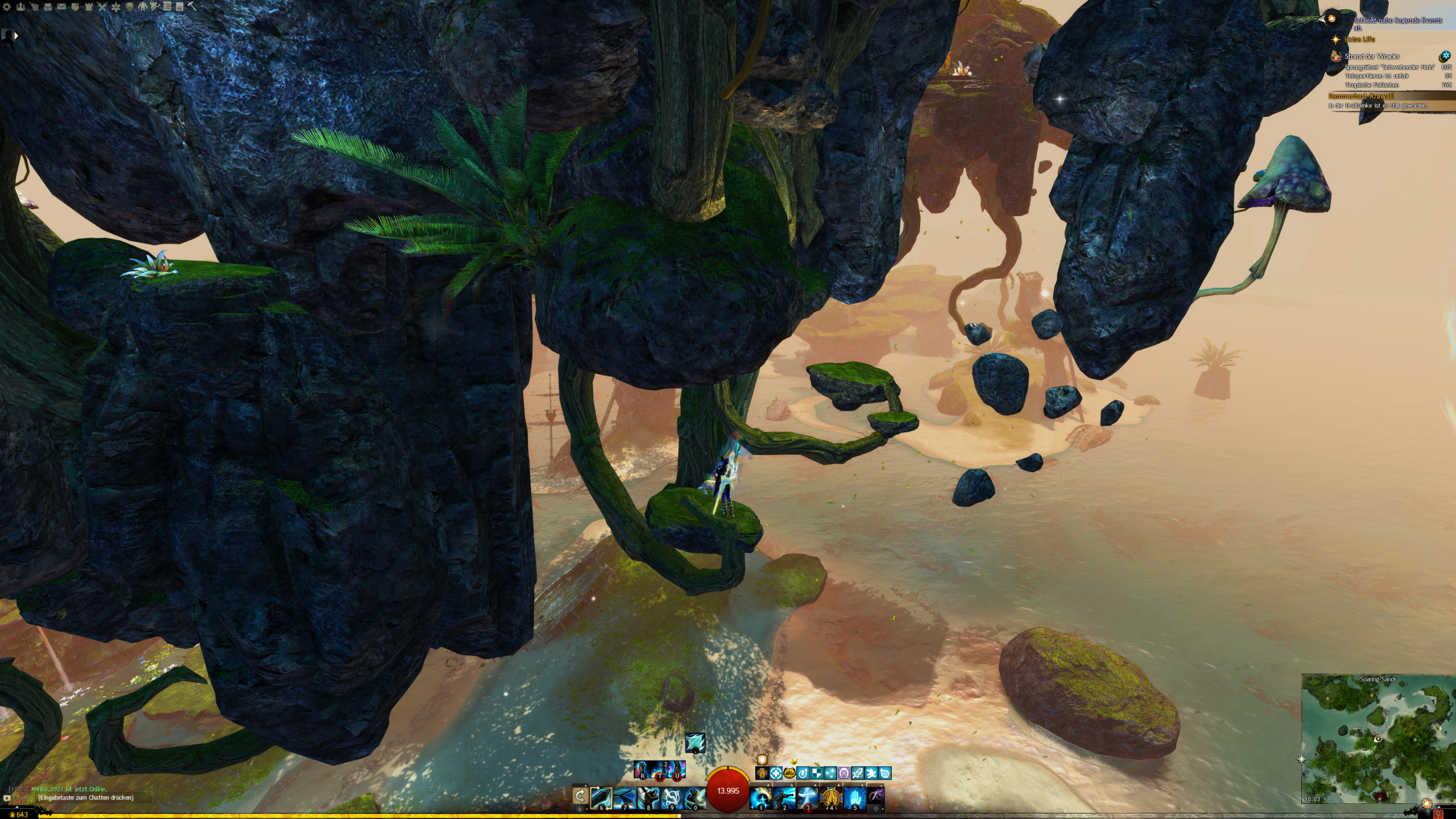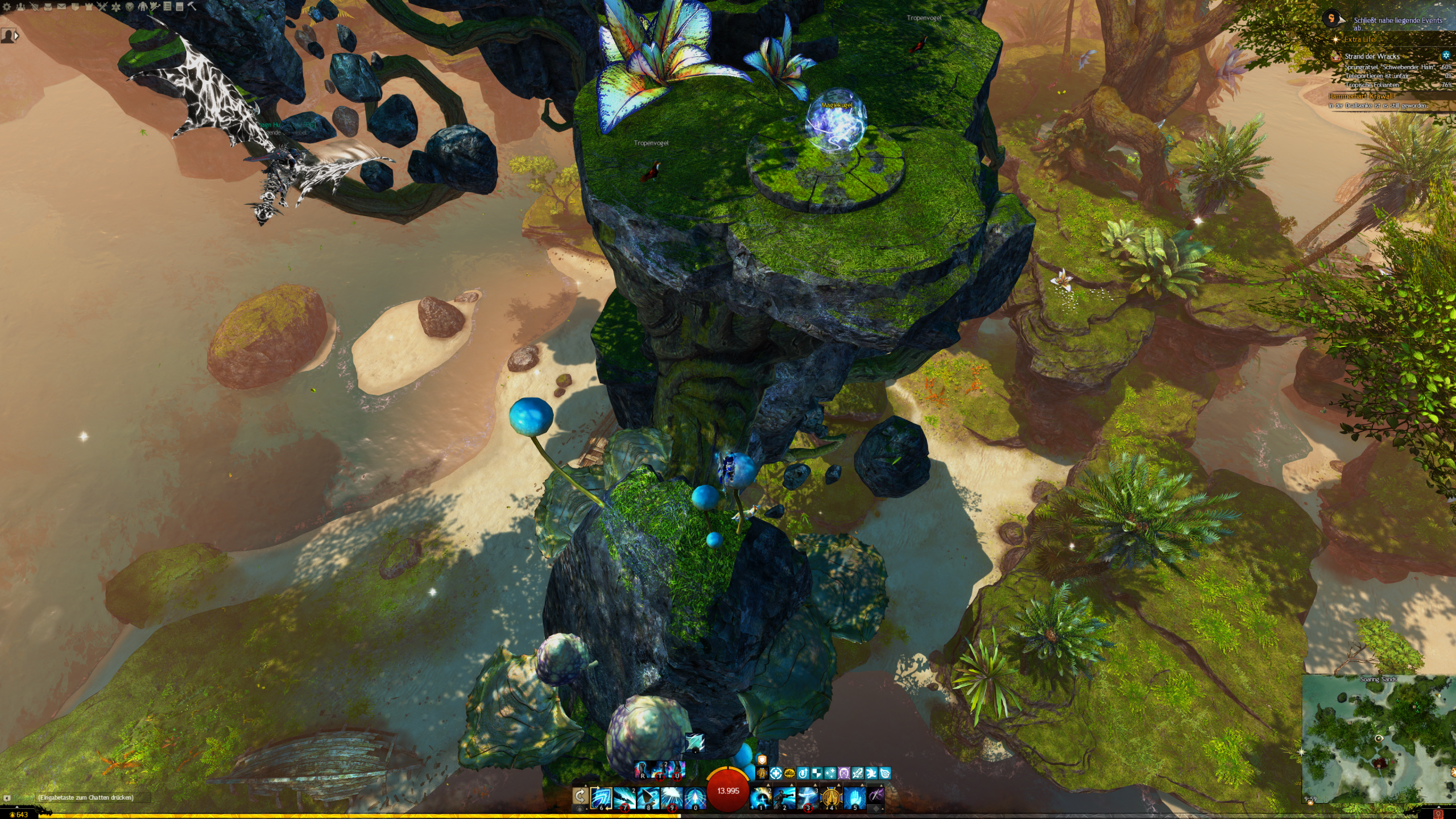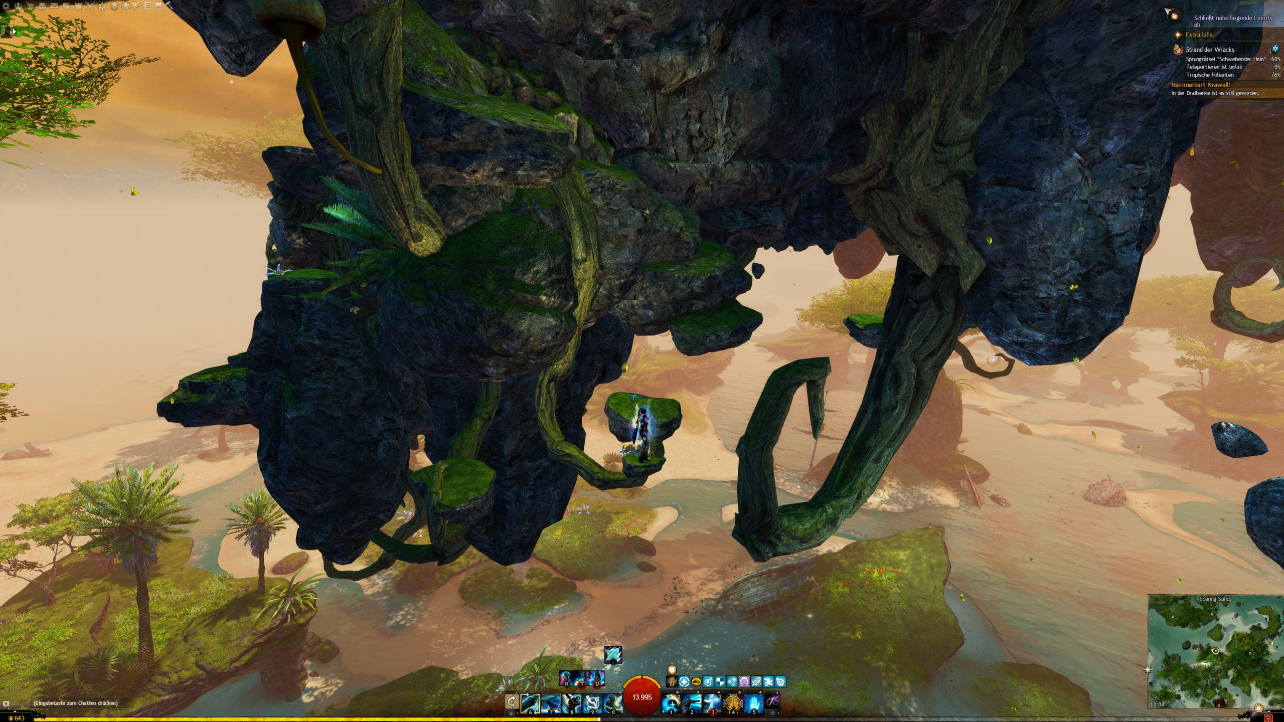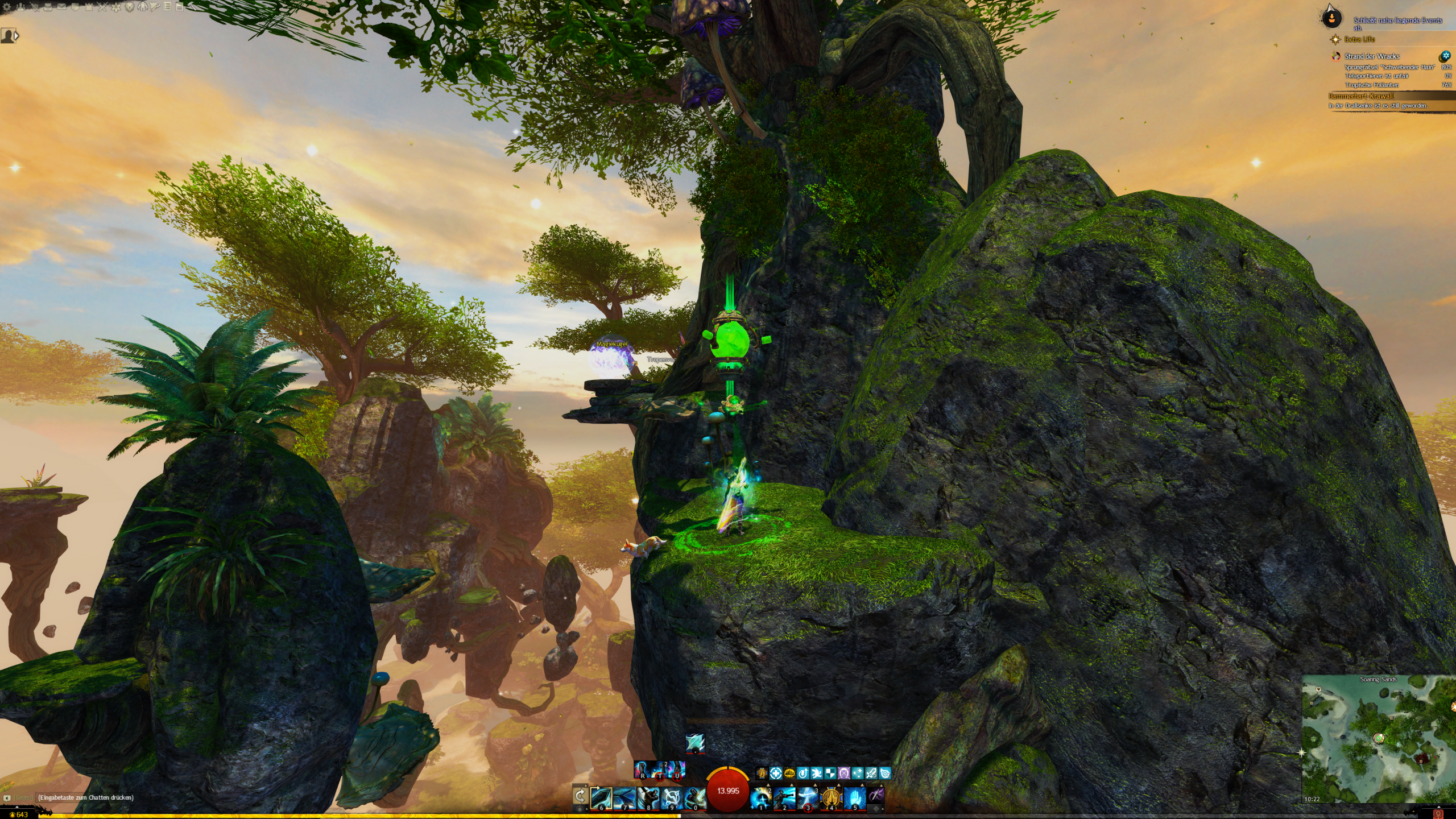 - die Jadebot-Wegmarke nutzen – Sie hat zwar einen hohen Cooldown, aber wenn ihr fallt öffnet ihr den Gleiter und portet euch hoch. OBACHT: Dabei verliert ihr jedoch den oben geannten zusätzlichen Erfolg!