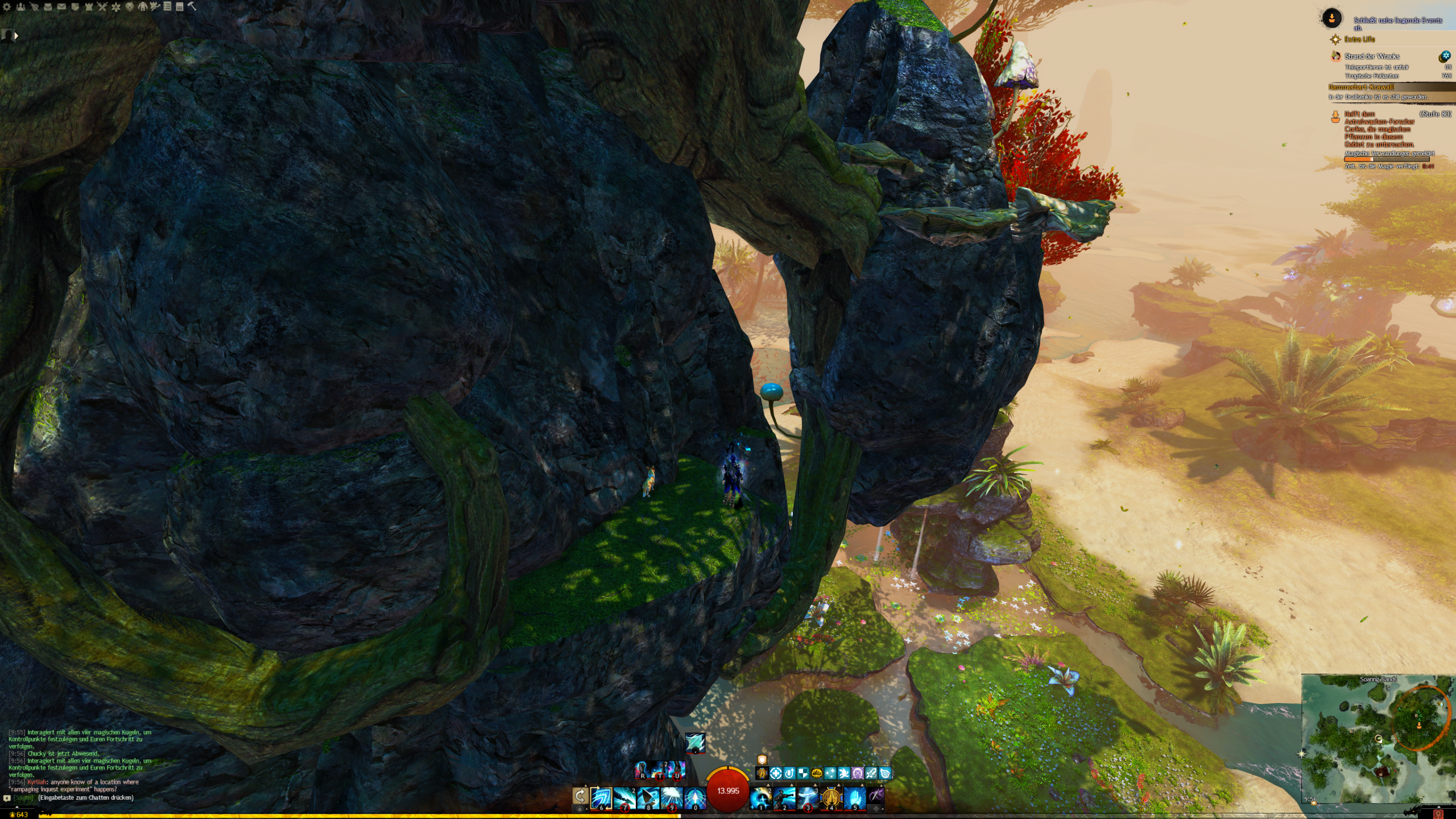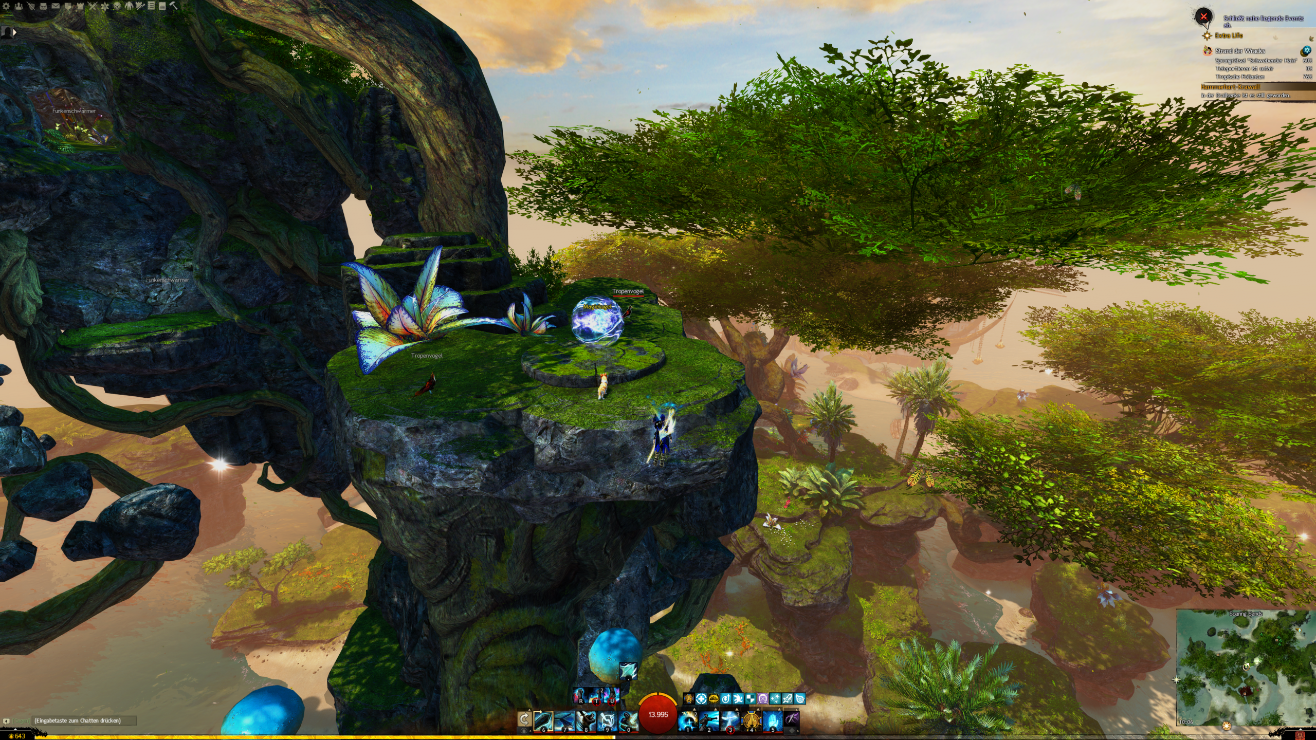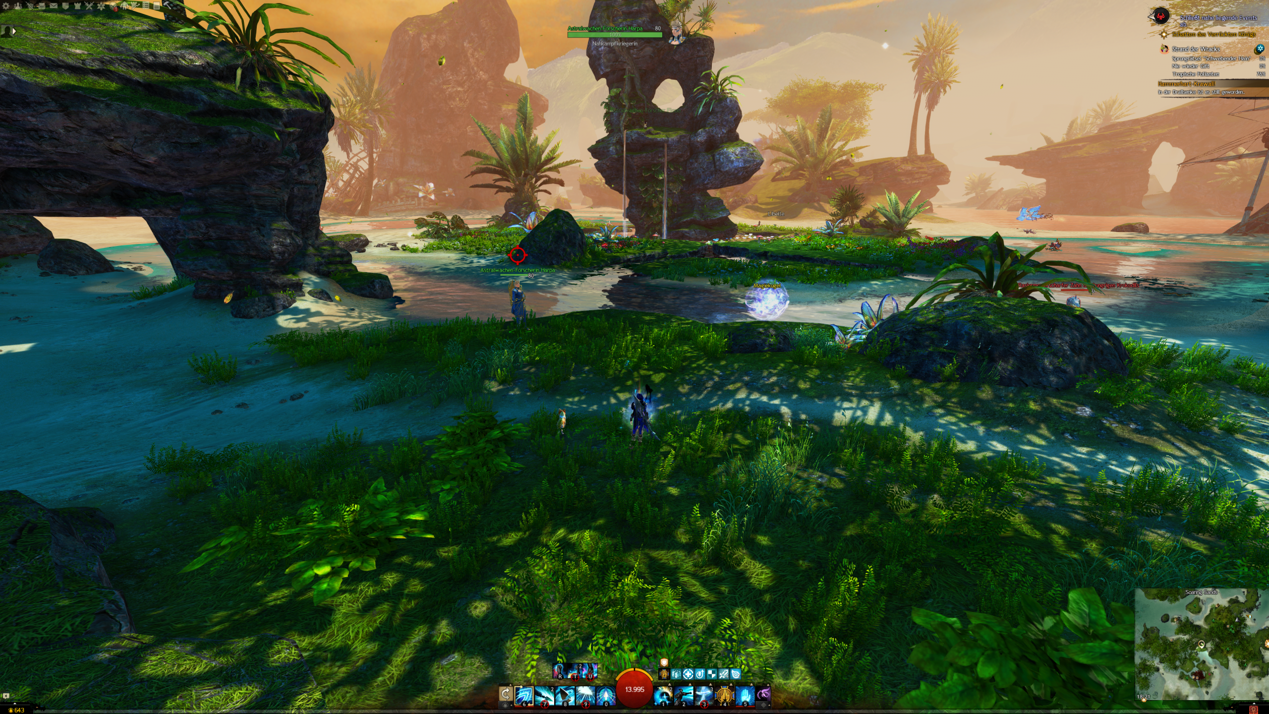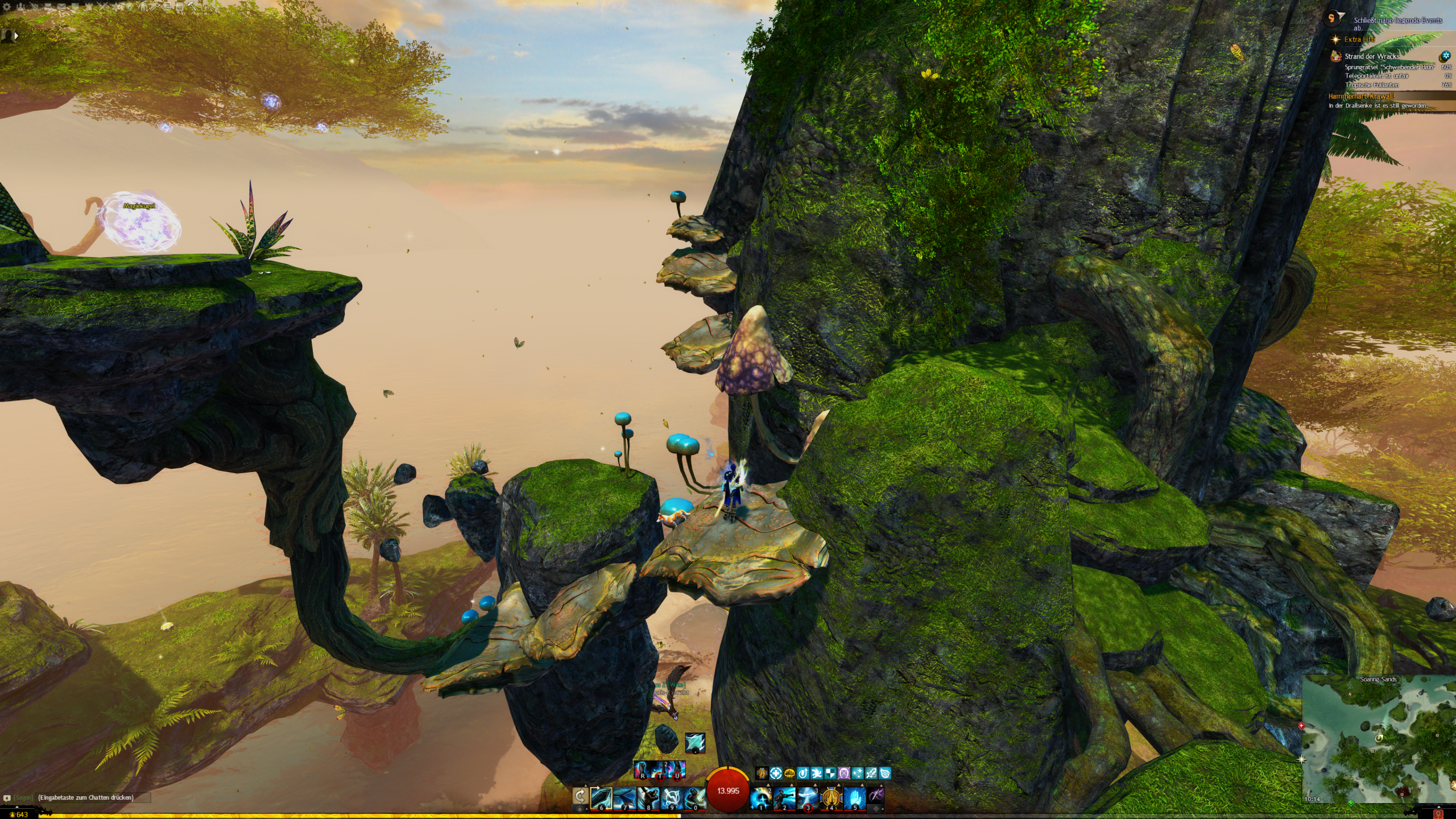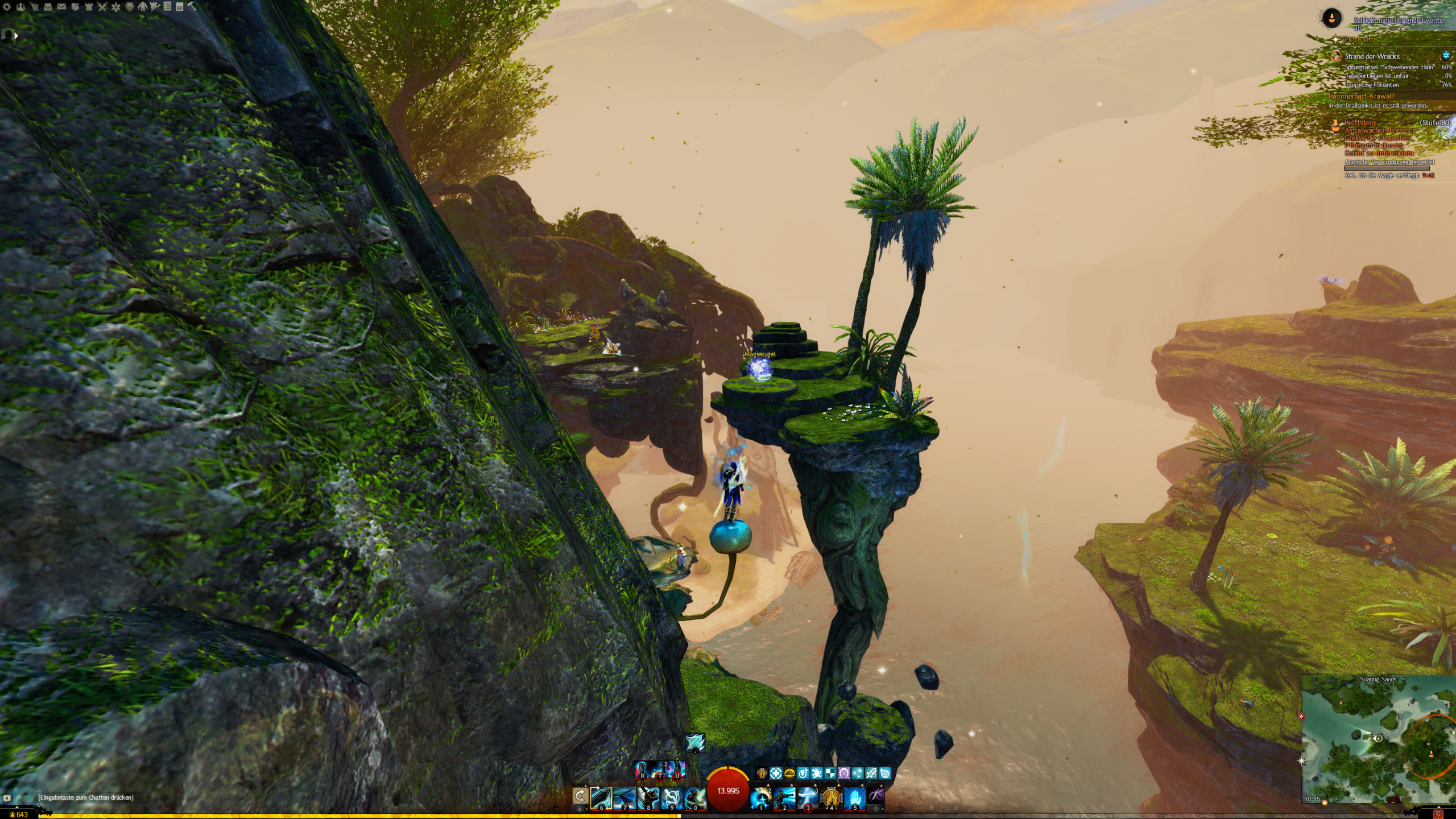 Findet alle Magiekugeln im Schwebenden Hain für Astralwachen-Forscherin Harpa. - "Ich untersuche gerade alle diese Kugeln, aber, äh ... ehrlich gesagt leide ich an Höhenangst." - Harpa